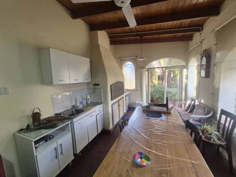 El exterior de la propiedad es igualmente impresionante, con un amplio patio ideal para actividades al aire libre y un quincho completo donde podrás disfrutar de reuniones con amigos y familiares. La casa también cuenta con una cochera cerrada para un vehículo.